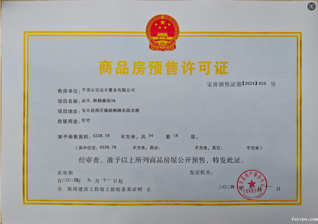 关于宝丰县宝运丰置业有限公司开发的运丰·梧桐森语项目3#、5#商品房预售许可证的公示